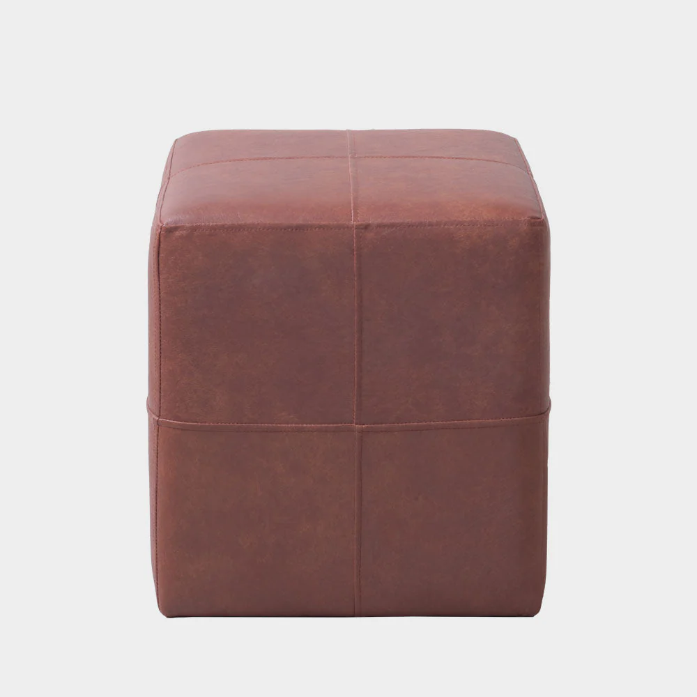 A Mid-Century Modern square ottoman with stitching in leatherette and kiln-dried tanguile wood with plywood frame. Size: L45xW45xH45 cm Weight capacity: 70 kg