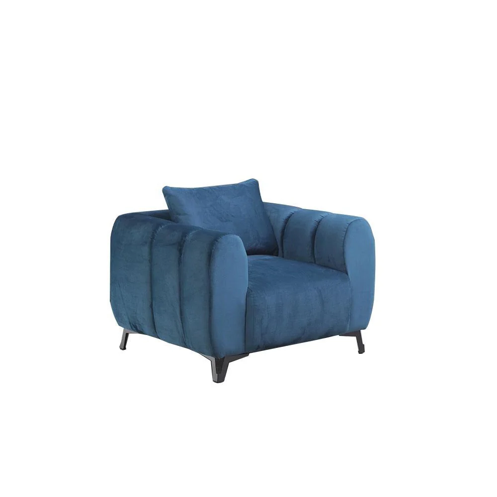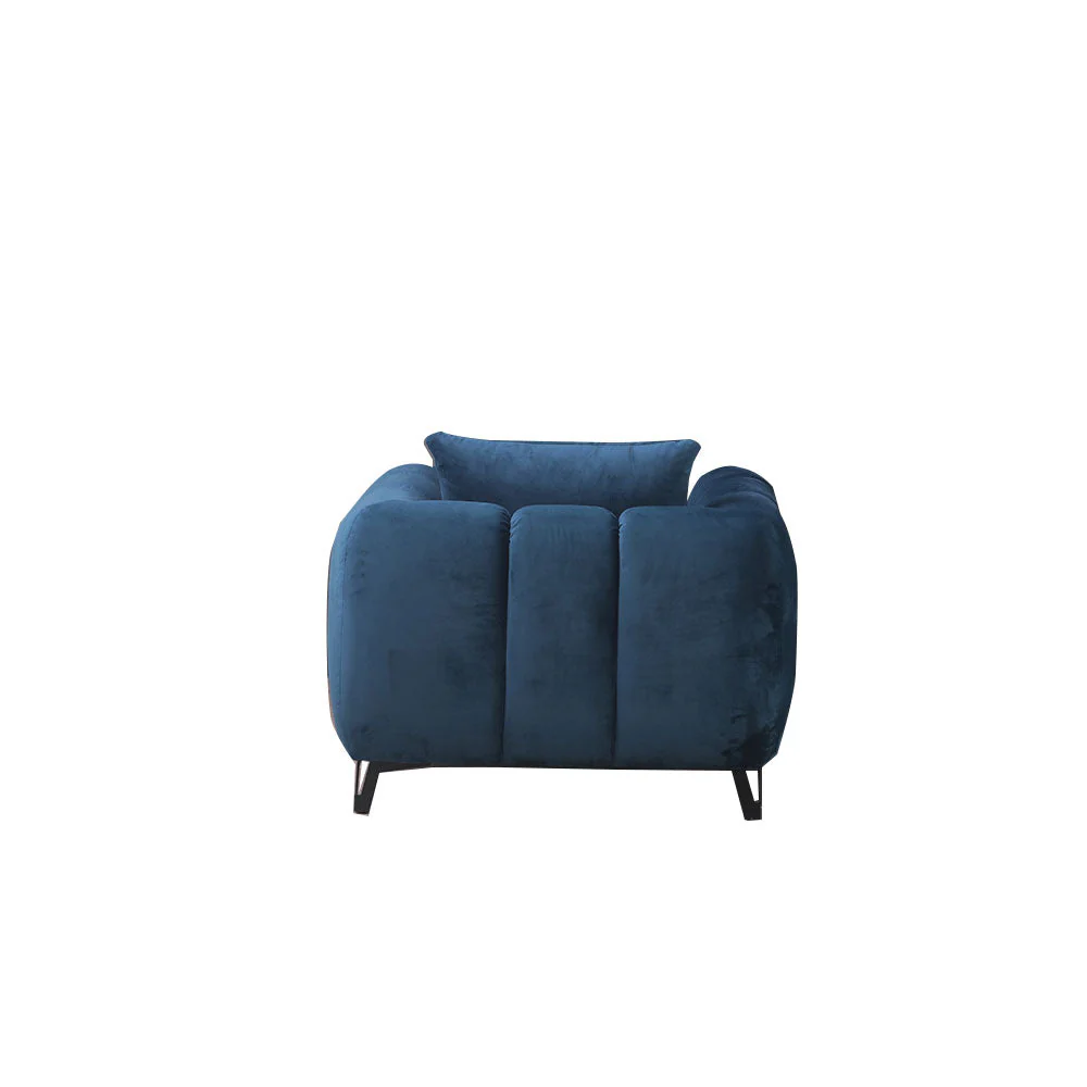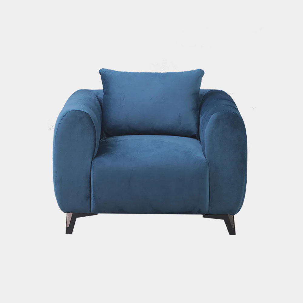 A Modern Contemporary accent chair made from high density polyurethane foam with gmelina wood frame, upholstered in velvet fabric with black powder coated metal legs. Size: L96.52xW91.44xH81.28 cm Weight capacity: 250 kg