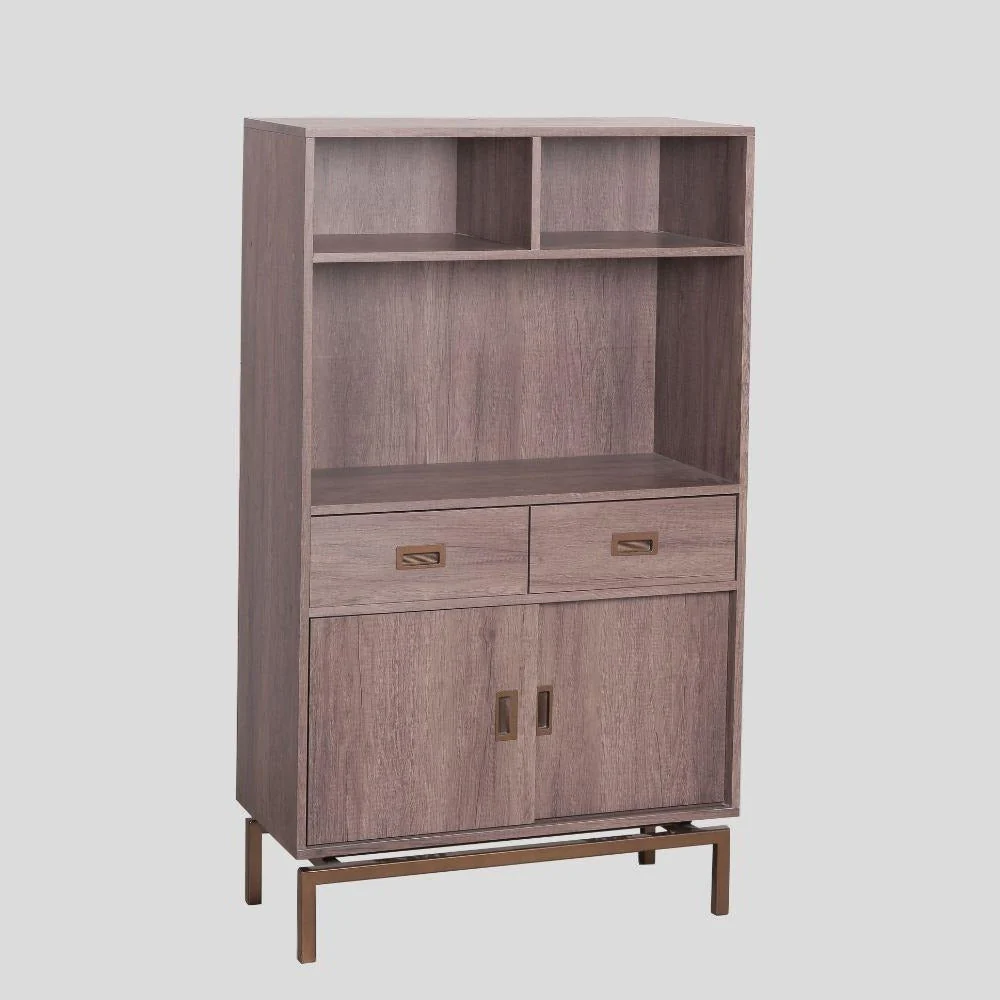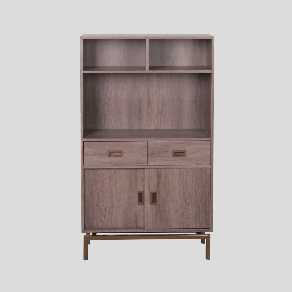A Modern Contemporary shelving with drawers made from medium density fiber board, laminated with imported PVC vinyl, and has square tubular metal legs painted with antique gold powder finish. Size: L80.01×60.96×137.16 cm Weight capacity: 45 kg
