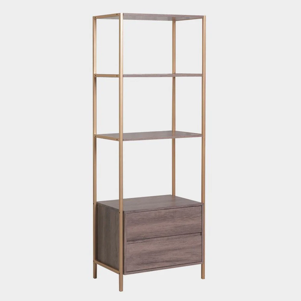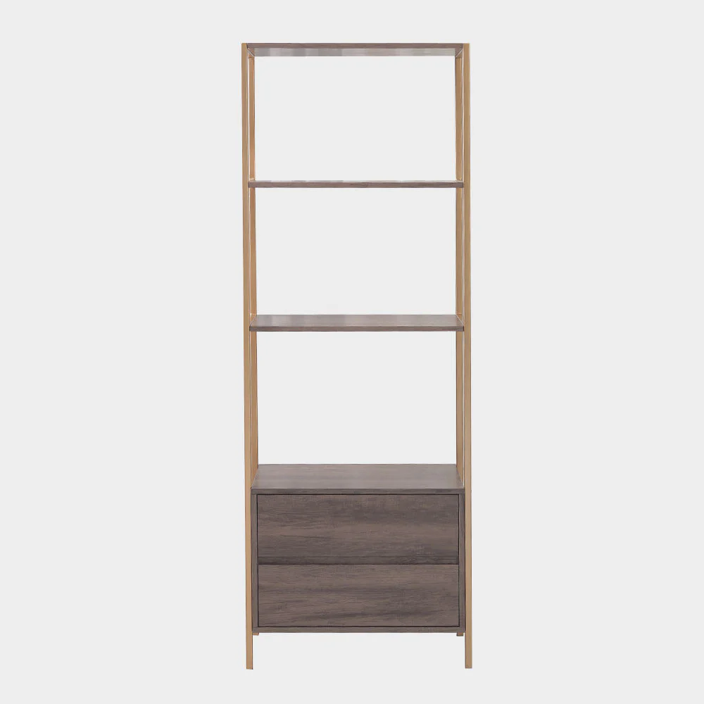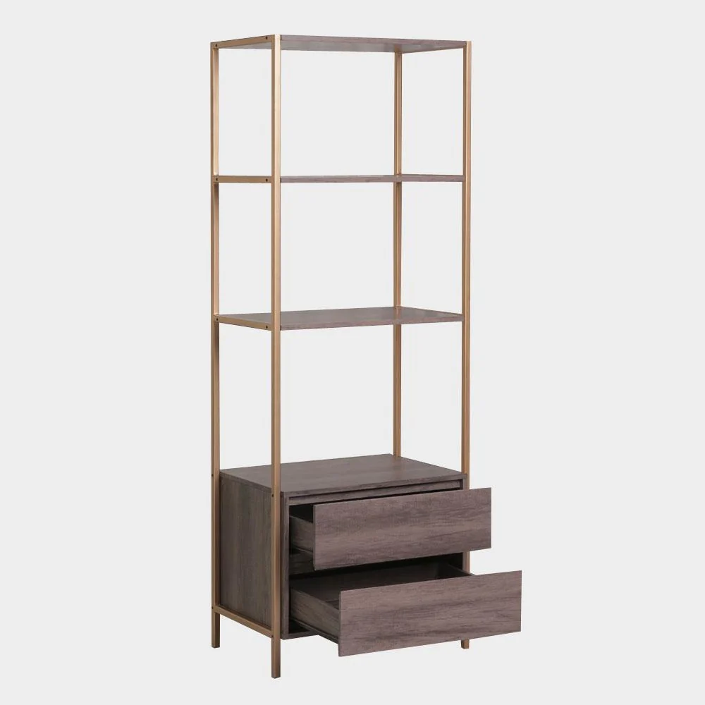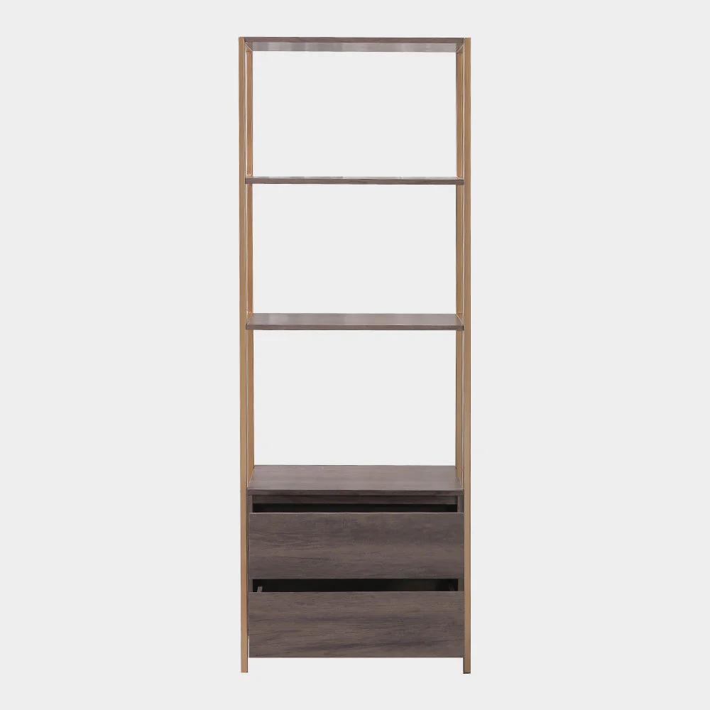 A Modern contemporary shelving with drawers made from medium density fiber board, laminated with imported vinyl and legs in metal antique gold finish. Size: L60xW44xH180 cm Weight capacity: 45 kg