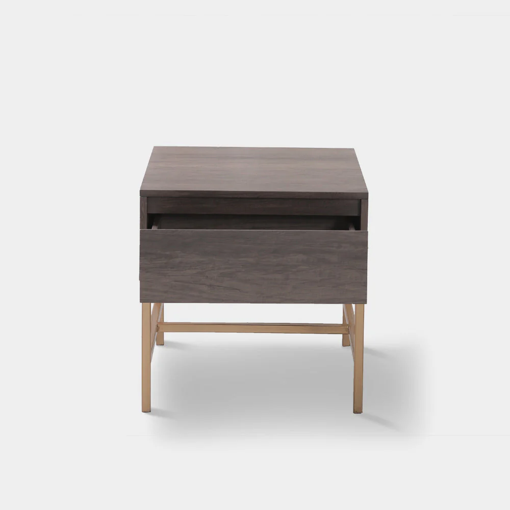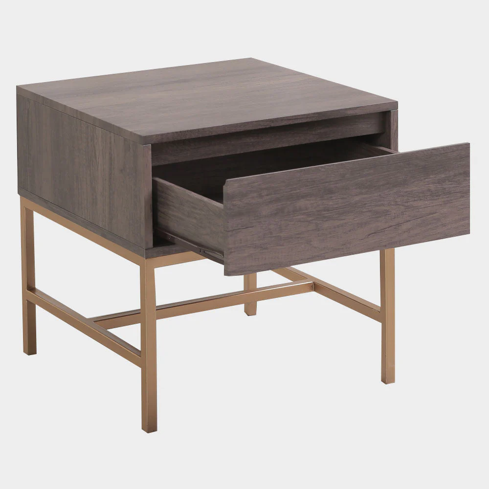 A Modern Contemporary side table with drawer made from medium density fiber board, laminated with imported vinyl and legs in metal antique gold finish. Size: L50xW50xH50 cm Weight capacity: 25 kg