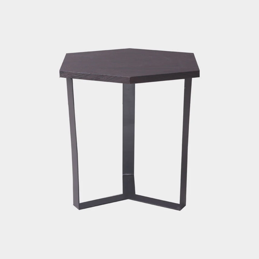 An Industrial hexagonal side table made from medium density fiber board, laminated with imported vinyl and has metal base painted in black finish. Size: L50xW50xH55 cm Weight capacity: 10 kg