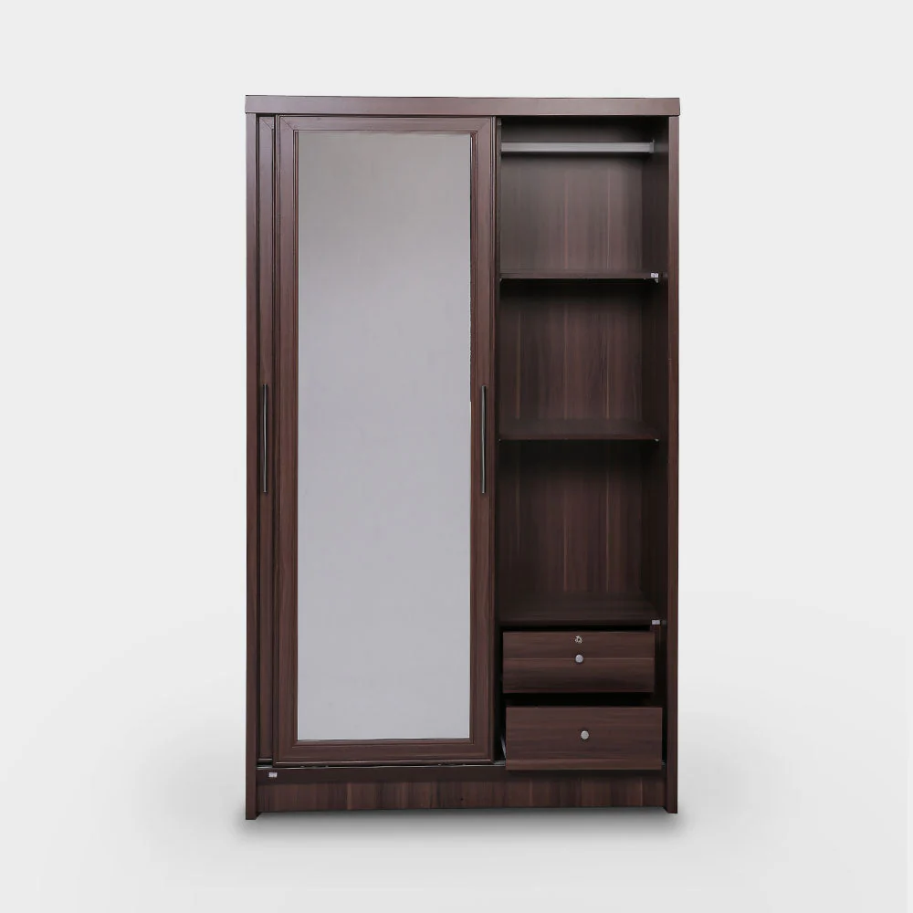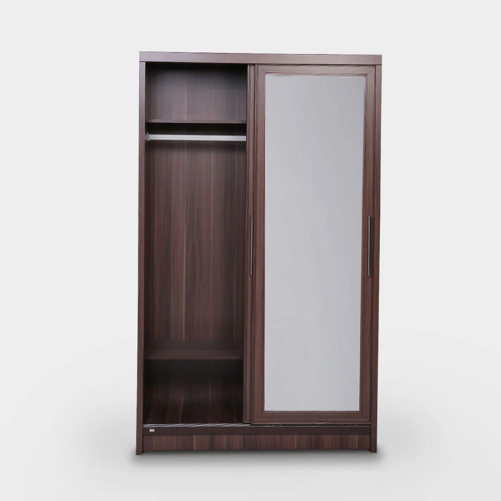A Modern Contemporary wardrobe with sliding door with full-length mirror constructed from particle board with MDF. Size: Small L60.88xW119.98xH203.20 cm