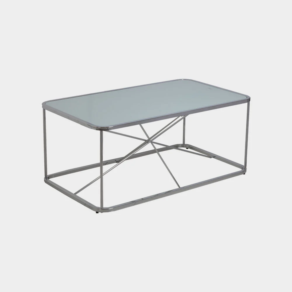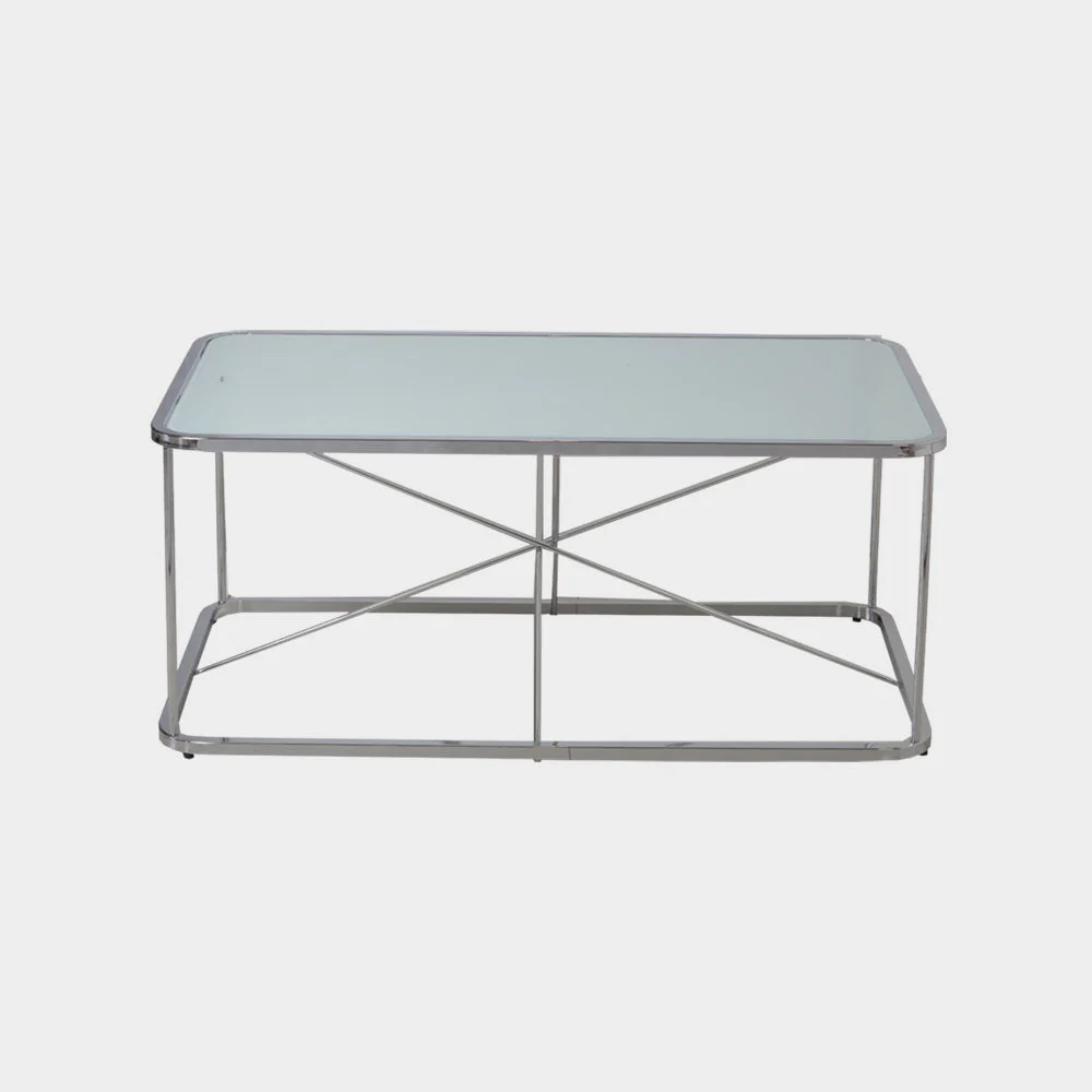 A Modern Contemporary center table made from 20mm square tube, round tube in chrome, and 5mm mirror glass top. Size: L107xW61xH46 cm