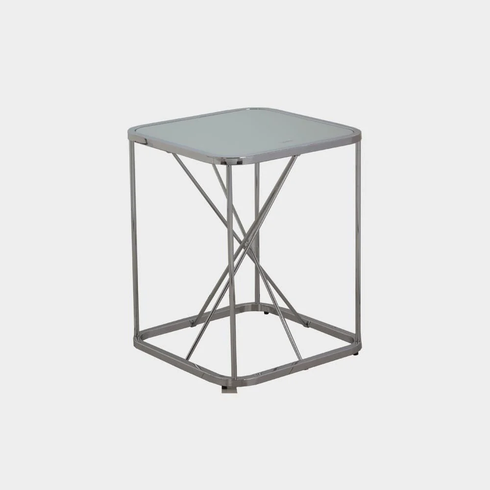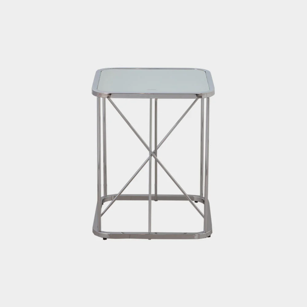 A Modern Contemporary side table made from 20mm square tube, round tube in chrome and 5mm mirror glass top. Size: L46xW46xH57 cm