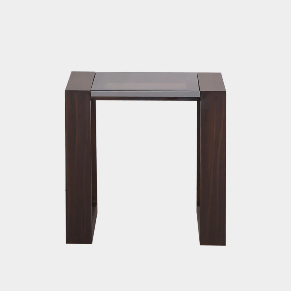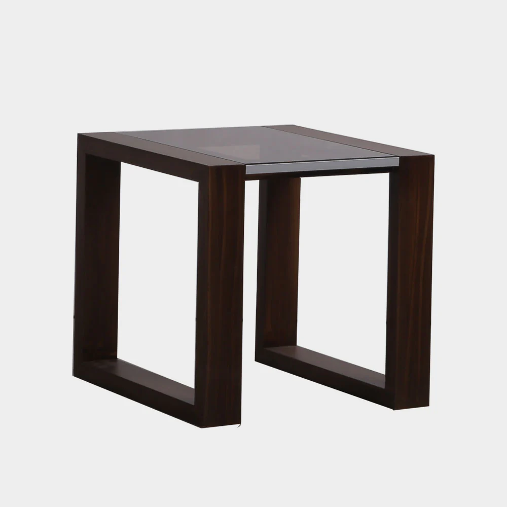 A Modern Contemporary style side table made from kiln dry solid wood, with tempered bronze glass table top and aluminum edging detail. Size: L60xW60xH60 cm Weight capacity: 10 kg