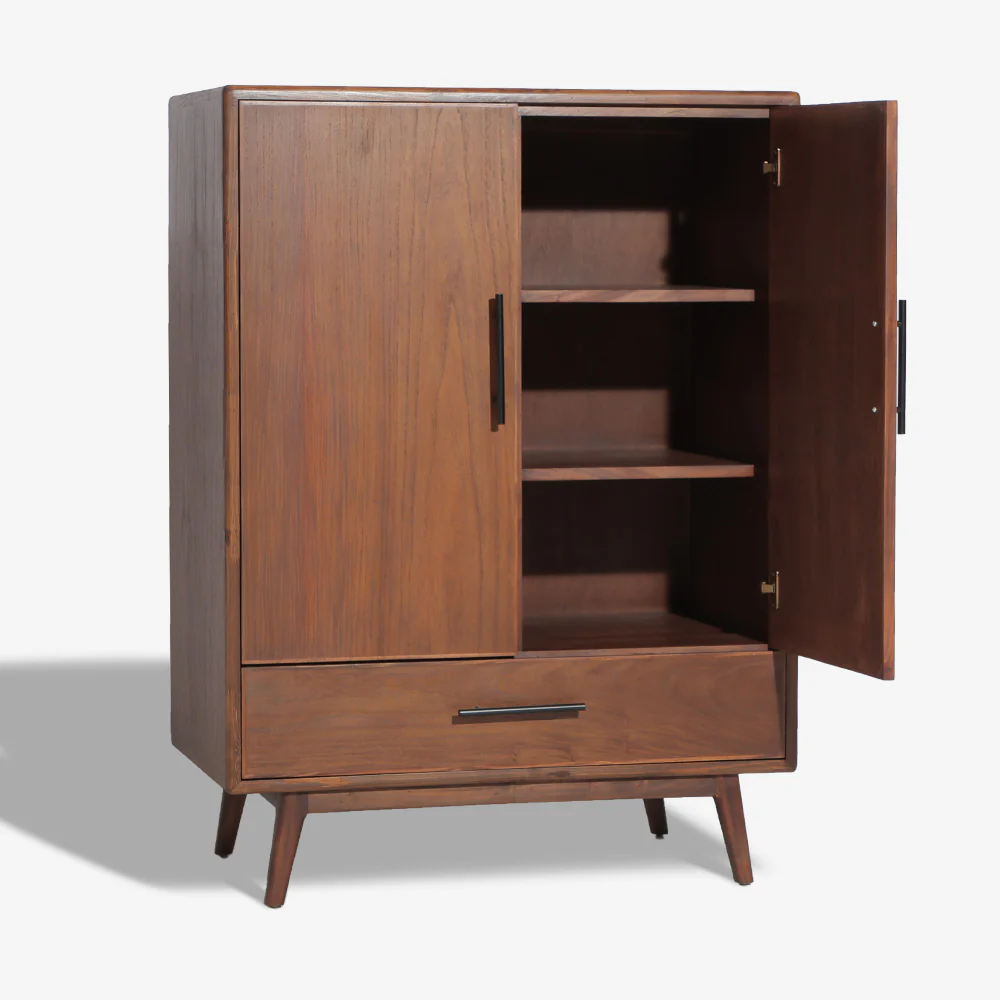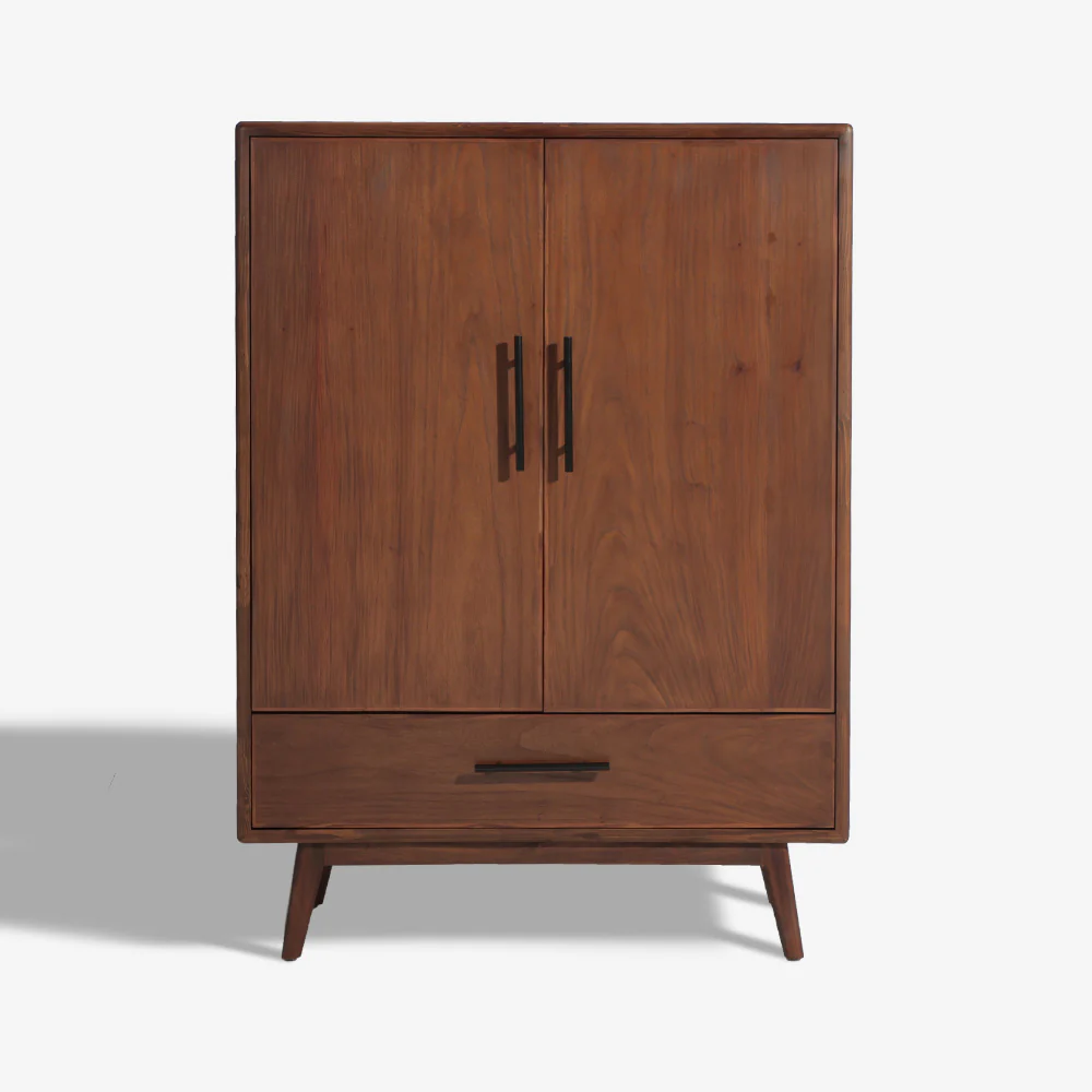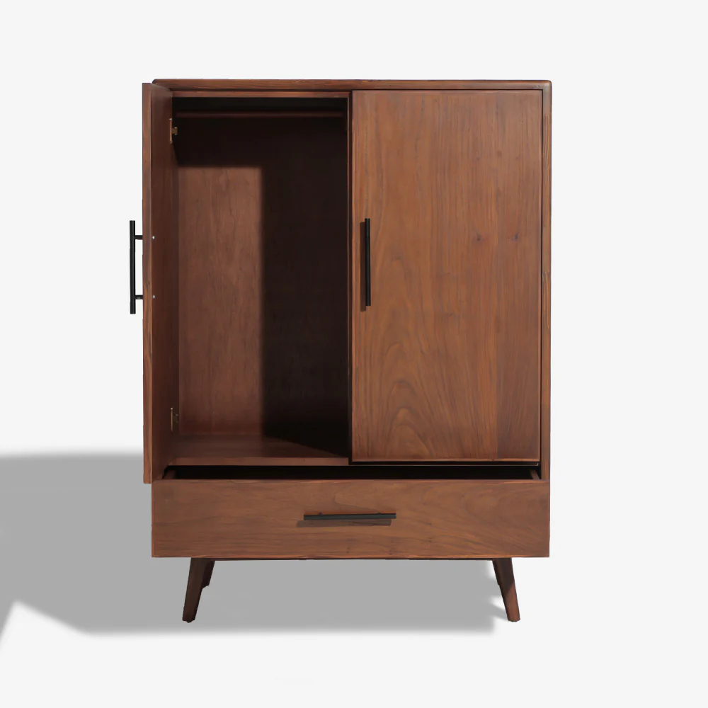 A Mid-Century Modern wardrobe made from composite oak, narra, kiln dried pinewood and solid wood footings. Size: L92xW52xH126 cm Weight capacity: 25 kg
