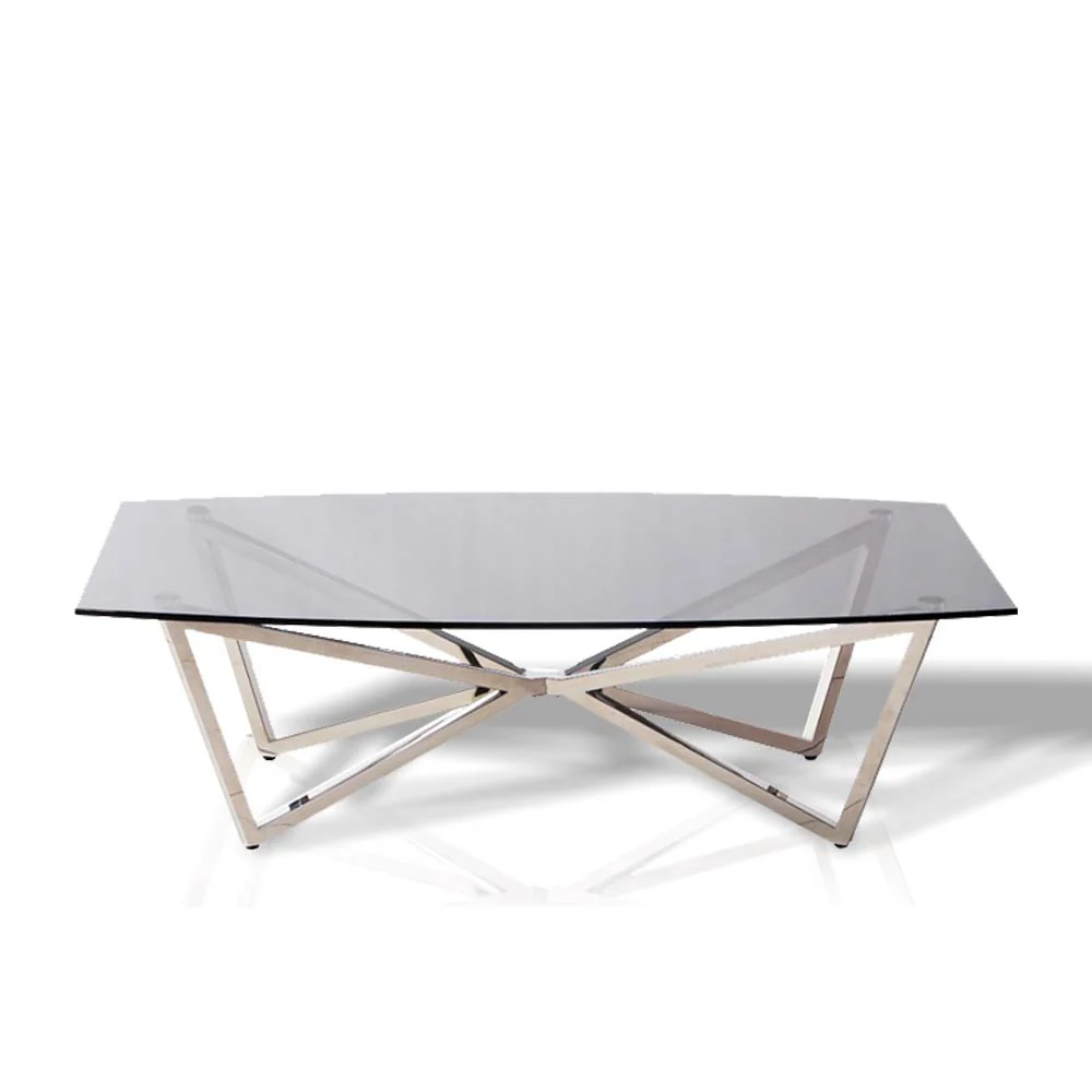 A Modern Contermporary style center table with polished stainless steel base and tempered smoke glass table top. Size: L130xW80xH38 cm299