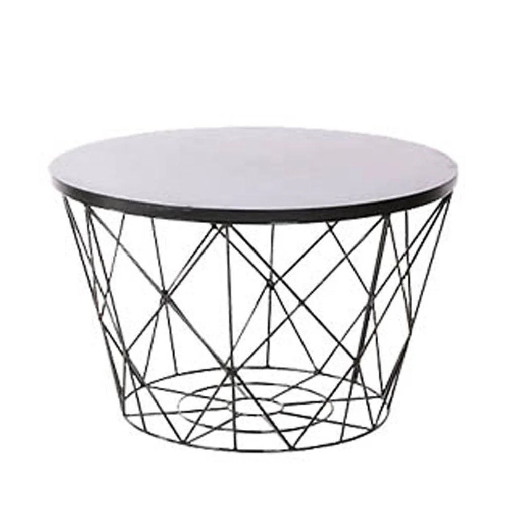 An Industrial round center table with geometrical solid wire metal base with laminated top. Size: D96.5xH45.7 cm Weight capacity: 90 kg