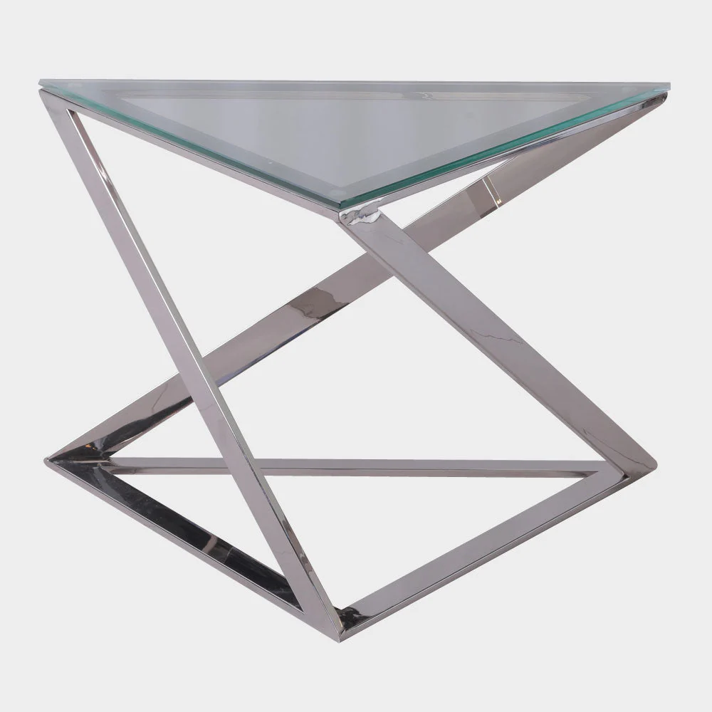 A Modern Contemporary triangular side table with clear tempered glass top and metal chrome legs in silver finish. Size: L60xW69xH44 cm Weight capacity: 40 kg