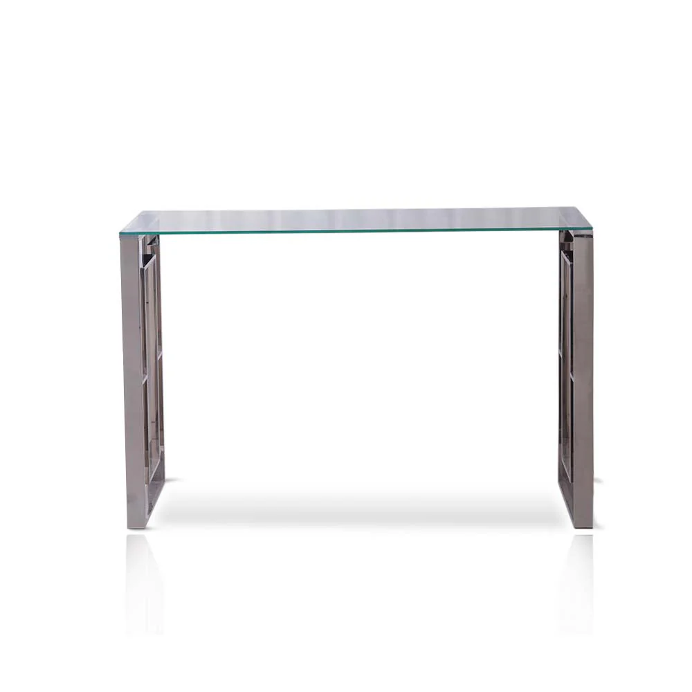 A Modern Contemporay style console table made with metal chrome framing with clear tempered glass table top. Size: L120xW40xH78 cm Weight capacity: 45 kg