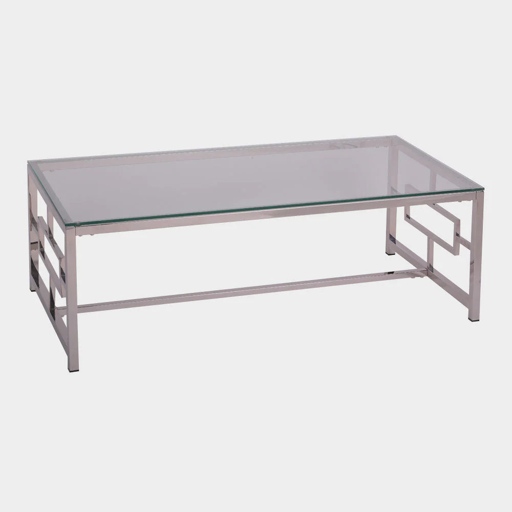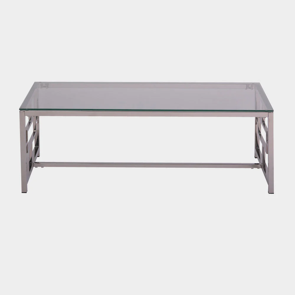 A Modern Contemporary center table inspired by a lattice pattern. Clear tempered glass with metal chrome legs in silver finish. Size: L120xW60xH40 cm