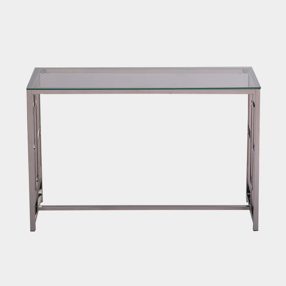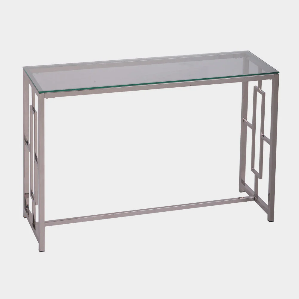 A Modern Contemporary console table inspired by a lattice pattern. Clear tempered glass with metal chrome legs in silver finish. Size: L120xW40xH78 cm