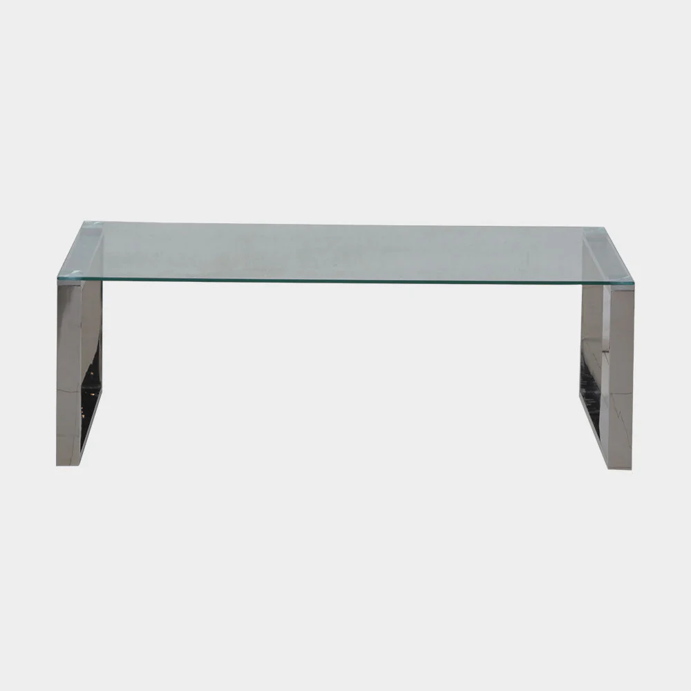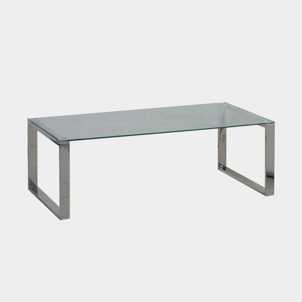 A Modern Contemporary center table in a clean linear design. Clear tempered glass with metal chrome legs in silver finish. Size: L120xW60xH40 cm