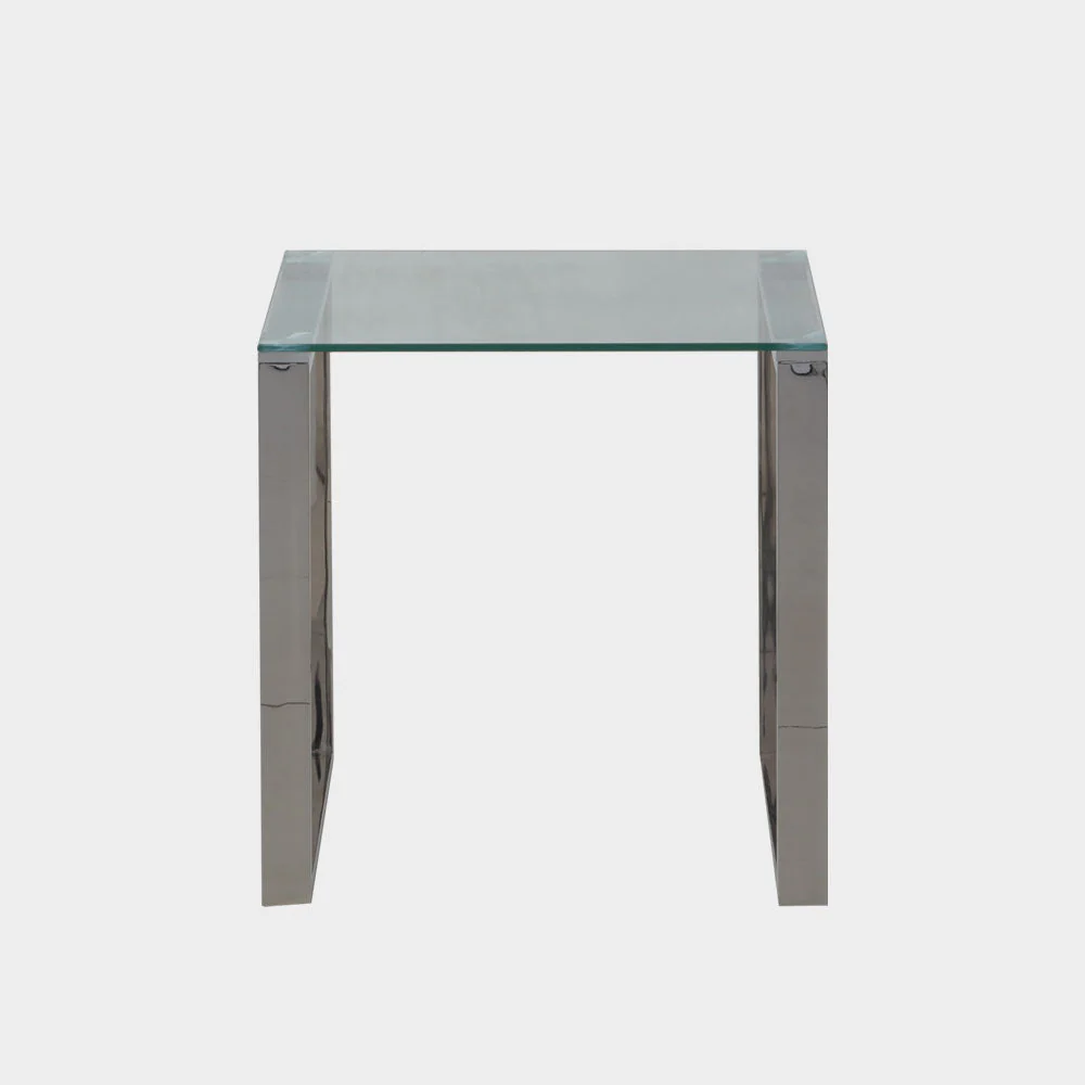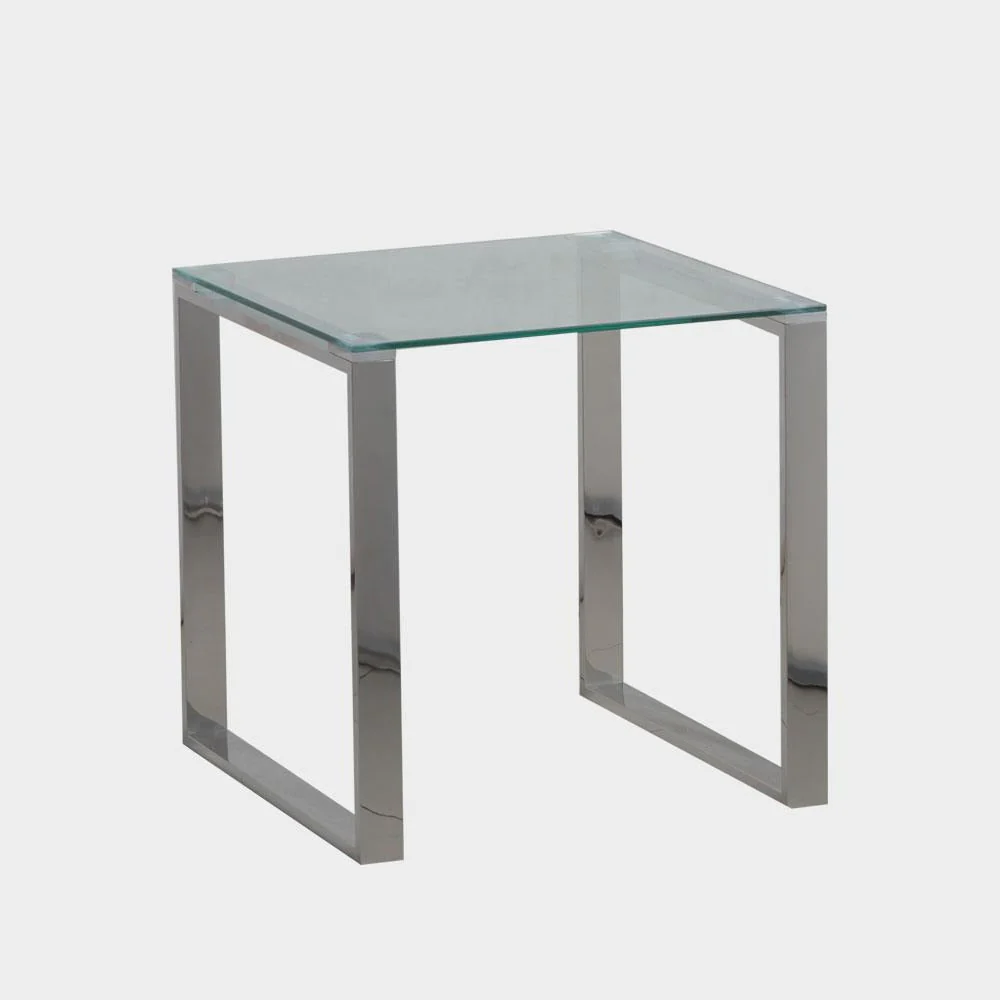 A Modern Contemporary side table in a clean linear design. Clear tempered glass with metal chrome legs in silver finish. Size: L55xW55xH55 cm